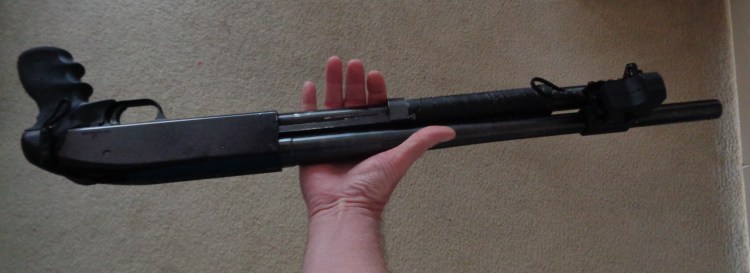 In conclusion, a Pistol Grip Only (PGO) shotgun is more compact than a stocked weapon, making it easier to store in and deploy from a vehicle (why the police originally used it) and is more maneuverable in confined spaces. It also does not punish the shooter anywhere near what a stocked shotgun does. The hard plastic grip provided with many off-the-shelf cruisers does hurt the hand and a soft rubber after-market grip like the Hogue Tamer solves that problem. The main problem is aiming it. An offset sight is a trade-off as it adds complexity and due to the sight sticking out from the side of the barrel is not quite as easy to store. The “bazooka” position is also a quite different technique compared to “shouldering” and aiming requires an unorthodox offset sight picture. In my view the pros outweigh the cons.